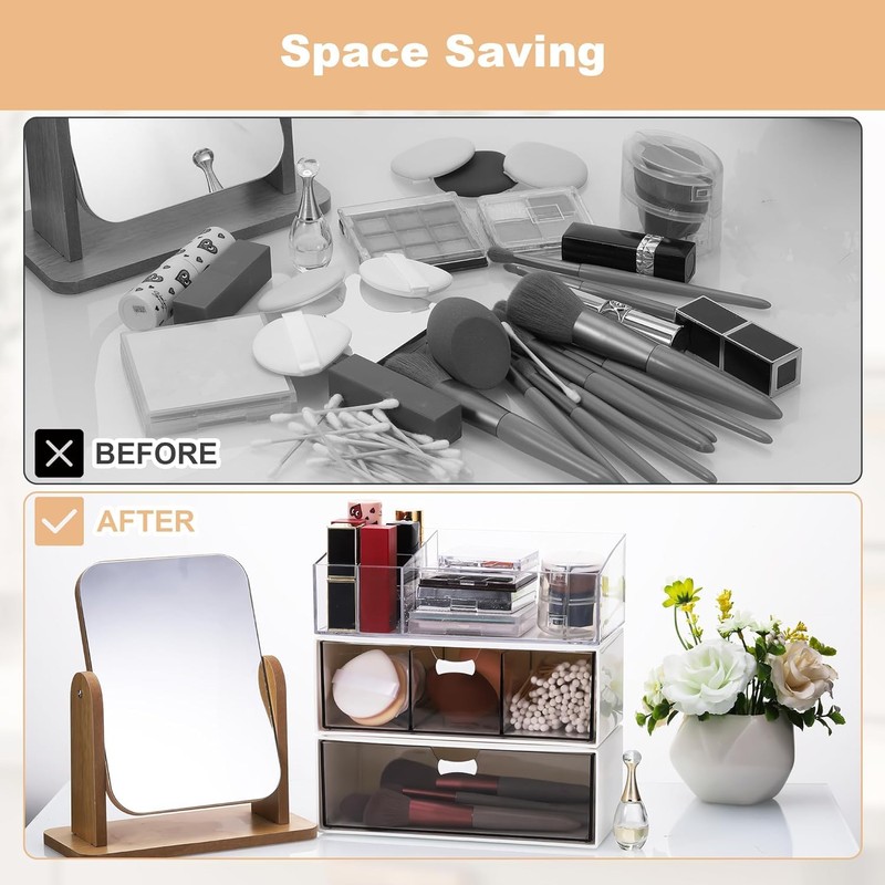 • 【Dreifach-Kombination von Behältern】Unser Grillix Make-up Organizer besteht aus einer Kombination aus einem Fach + Dreifachfach + Lippenstiftfach; Sie können die Anordnung jeder Schublade flexibel an die Art und Menge der Kosmetika anpassen, um eine Verteilung auf Anfrage zu erhalten. In der Zwischenzeit kann es stabil gestapelt werden, um das Platzproblem zu lösen. Es kann Ihren Schreibtisch ordentlich machen.