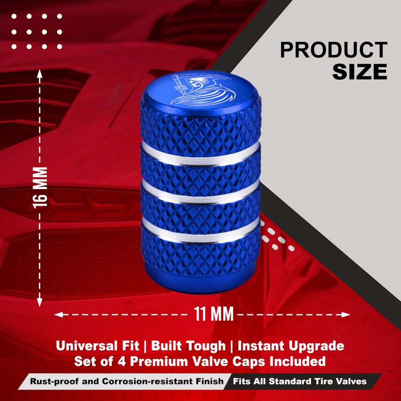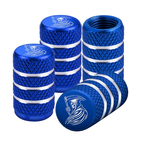 Grim Reaper Tire Valve Stem Caps, Metal, Universal Fit for Cars, Trucks, SUV, Motorcycles, Custom Automotive Accessories, 4pc Set (Blue)