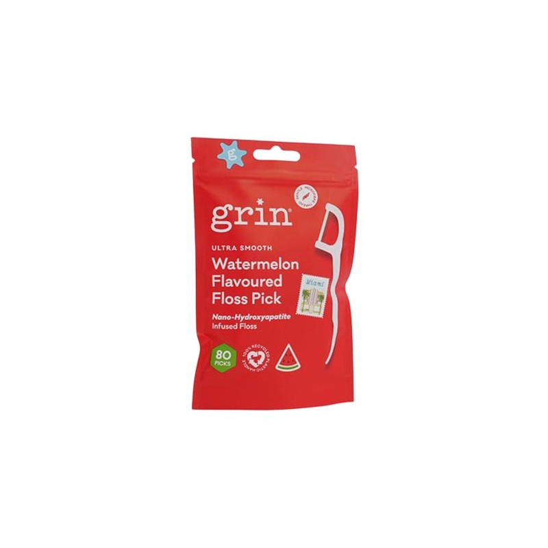 Grin Ultra Smooth Watermelon Flavoured Floss Picks, 80 Pack, Nano-Hydroxyapatite Infused, 100% Recycled Plastic Handle, Premium UHMW PE Floss