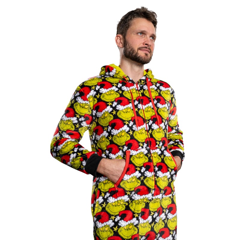 - Officially Licensed Grinch Jumpsuit: Celebrate the holidays in style with this Grinch Pajamas Jumpsuit featuring the Grinch’s face adorned with a Santa hat in a playful, all-over pattern. Perfect for Christmas or Halloween celebrations.