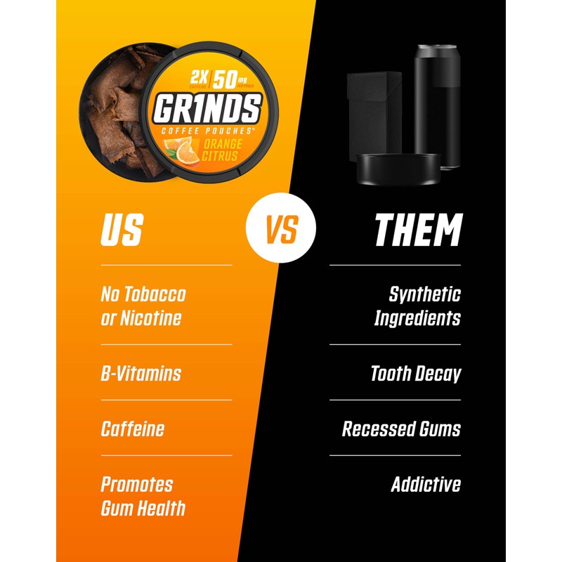 • NICOTINE-FREE: There is no tobacco or nicotine in Grinds Coffee Pouches. Were proud to call ourselves a healthy alternative to chewing tobacco. The active ingredient in Grinds is coffee, which gives you a boost of energy from caffeine, not tobacco.
