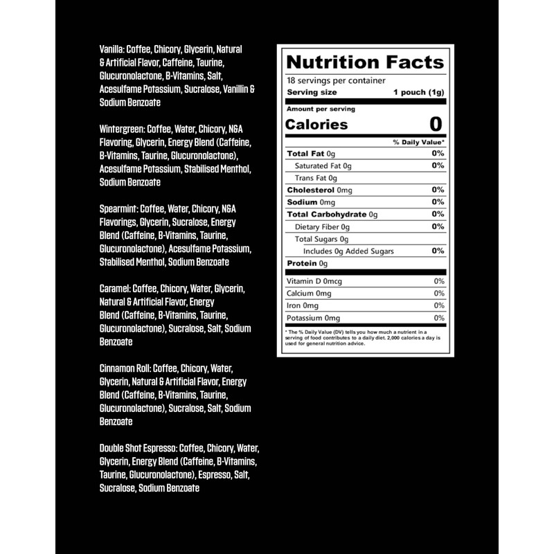 - ENERGY BOOST: With 18 pouches per can, each coffee dip pouch equals about 1/4 of a cup of coffee, or approximately 2025 mg of caffeine, which makes each entire can of Grinds Coffee Pouches add up to the caffeine equivalent of 45 cups of coffee.