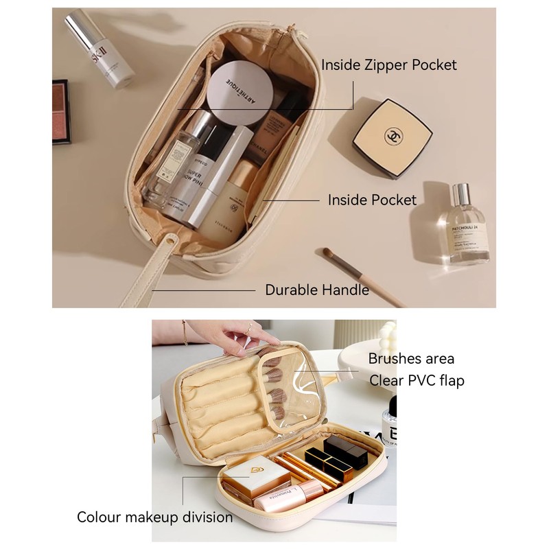 - 【Practial Design】 The makeup bag is divided into upper and lower storage areas, the bottom is a cosmetic partition for eye shadow, makeup brushes, lipsticks. The upper layer has a large opening for easy access, you can put skin care items, without mixing.