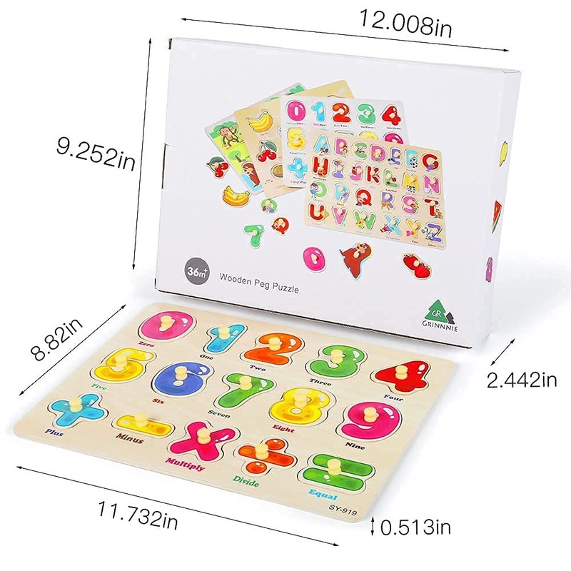 - [4 PACK WOODEN PEG PUZZLES SET]: Our puzzles set include a number puzzle with 15 pieces numbers, a ABC puzzle with 26 pieces alphabet , a wild animal puzzle with 8 pieces animals, and a fruit puzzle with 11 pieces different fruits.