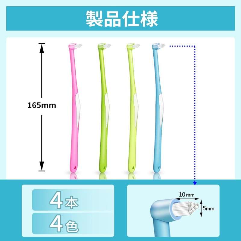 - パッケージ内容: タフトブラシ4本入、4色(ブルー、グリーン 、イエロー、レッド)。ワンタフトブラシ 矯正用歯ブラシ 入りやすい 柔らかく、しっかり磨けて。ワンタフト 歯ブラシ 全長165mm、毛の材質:PBT、ハンドル:ポリプロピレン。