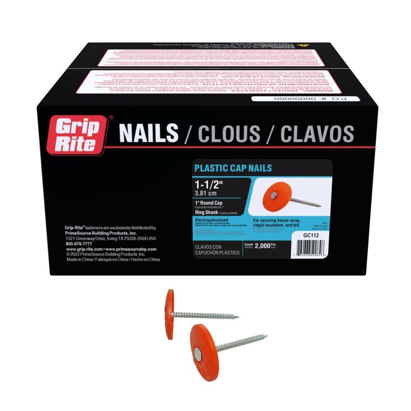 Grip-cap nail primarily used for anchoring house-wrap, sheathing and felt paper. Wide head and ringed shank for greater holding power. PrimeSource Building Products, Inc. is the largest purveyor of fasteners in the world and one of the largest distributors of building materials in the United States.