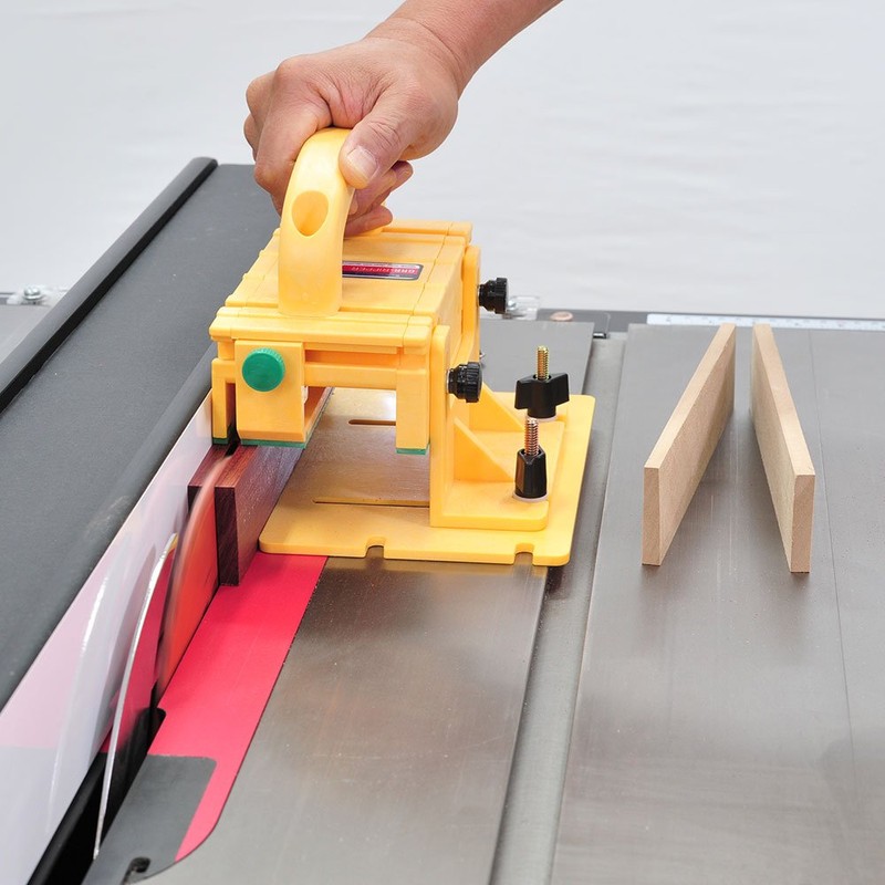 Precision woodworking hand pushing tool with adjustable/detachable components Utilizes multiple grooved non-slip pads for strong gripping & holding power Pushes & holds both sides of the work piece as it is being cut Pushes & holds the work piece as the saw blade passes through either right or left tunnel The handle, center leg & balance support are all fully adjustable
