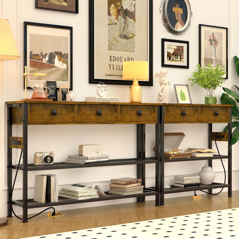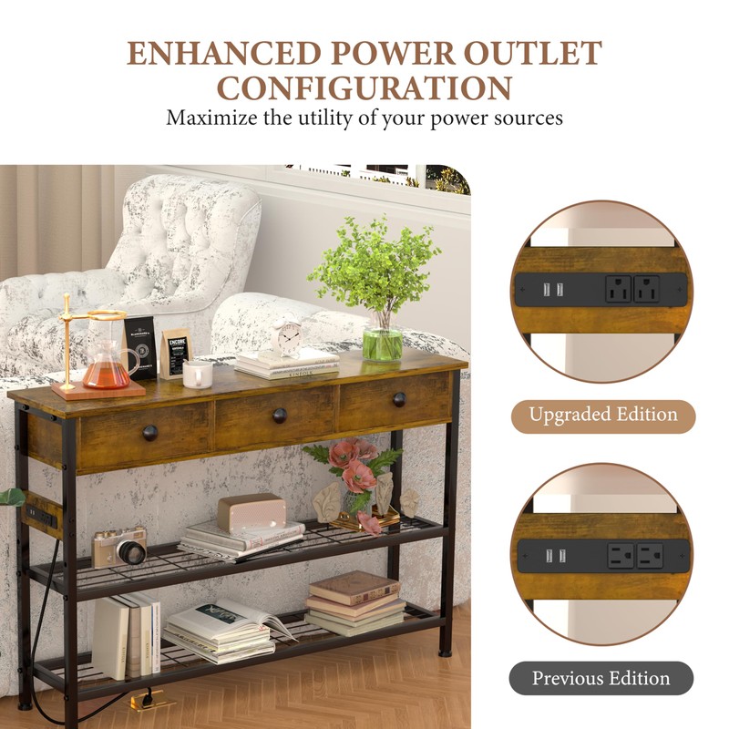 GRLEAF 47" Console Table with Outlets & USB Ports – Narrow Entryway Table with 3 Drawers and Storage Shelves, Power Strip Sofa Table for Living Room, Hallway, Kitchen, Foyer – Rustic Brown Wood Finish