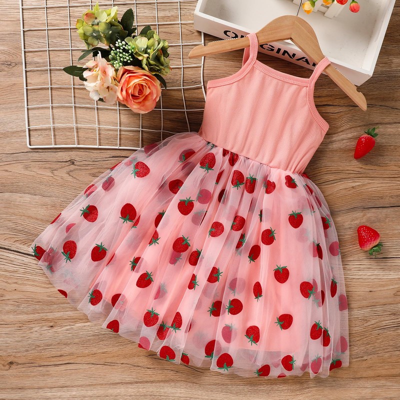 GRNSHTS Toddler Baby Girl Tutu Dress Sleeveless Strap Knit Tulle Dresses Party Princess Sundress (Pink Strawberry 5, 12-18M)