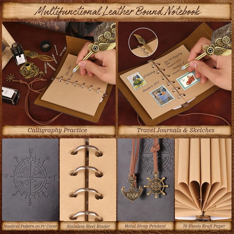 - Multifunctional Leather Bound Notebook:This calligraphy pens gift set includes a reusable PU leather notebook journal with a nautical-themed cover and a metal bookmark.The notebook features 70 sheets of kraft paper,making it perfect as calligraphy kits for beginners to practice calligraphy,DIY journaling,and sketches.