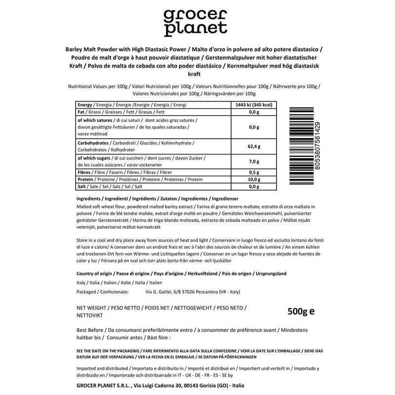 Grocer Planet - Diastatic Baking Malt (500g) | Barley Malt Flour with High Diastatic Power | For Better Yeast Fermentation and Browning | Made in Italy
