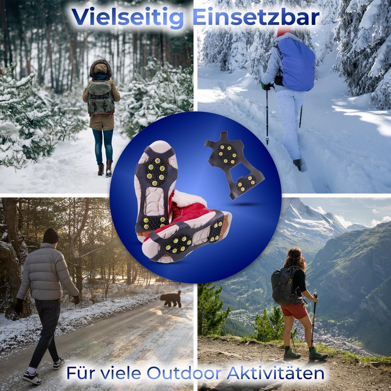 - Spikes for shoes: unlike fixed shoe spikes and shoe claws, our spikes for winter shoes can be quickly put on and taken off. They work like snow chains for shoes and provide good slip protection.