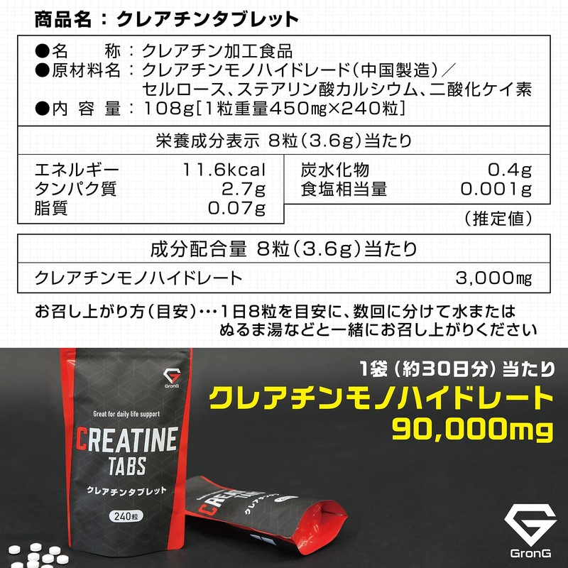- 【栄養成分 8粒(3.6g)当たり】エネルギー/11.6kcal、タンパク質/2.7g、脂質/0.07g、炭水化物/0.4g、食塩相当量/0.001g【原材料名】クレアチンモノハイドレード(中国製造)/セルロース、ステアリン酸カルシウム、二酸化ケイ素 【内容量】108g(1粒重量450mg×240粒)