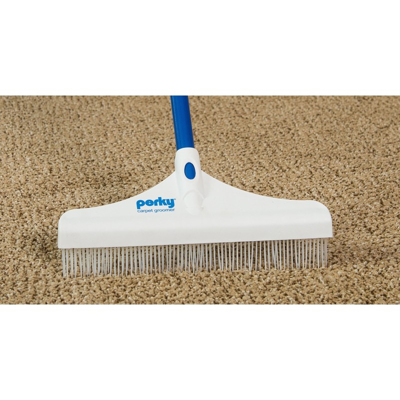 The Perky Groomer Carpet Rake is the smaller, economical version of the 18" Grandi Groom. The Perky Carpet Rake is perfect for getting the hard-to-reach areas between furniture that the Grandi Groom is too large for. The Perky Groomer Carpet Rake works great on high-pile carpets and reaches deep down into the carpet fibers to loosen dirt and soil vacuuming leaves behind. Upright vacuums go right over deep dirt and pet hair. The Perky Groomer pulls dirt and hair embedded in the carpet right to the surface for easy clean-up. Compare your results vacuuming, then using a carpet rake and vacuuming again. You won't believe how nice your carpet can look, until you've seen and felt it groomed with a Carpet Rake. Professional carpet cleaners use this exact tool to raise and open the pile before cleaning and then set the pile after cleaning to give it that brand new look. These nylon tynes dig deep into carpet fibers lifting the pile and agitating the soils deep within. Utilizing a carpet rake before vacuuming can increase effectiveness of vacuuming overall. Using a carpet rake on a regular basis will prevent the fibers from being damaged by dirt and particles that can shorten the life of your carpet by cutting and fraying fibers. This can help keep your carpet healthly looking and double the life. Use a carpet rake after shampooing to help air travel deep down to reduce drying times and eliminate crunchy carpet and of course,give it that brand new look.