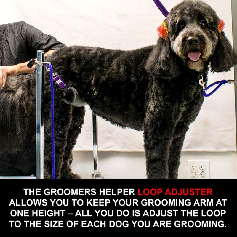 - GROOMING HELPER LOOP ADJUSTER: This Loop Adjuster adjusts to different sizes to accommodate different size dogs, without having to raise or lower your grooming arm.