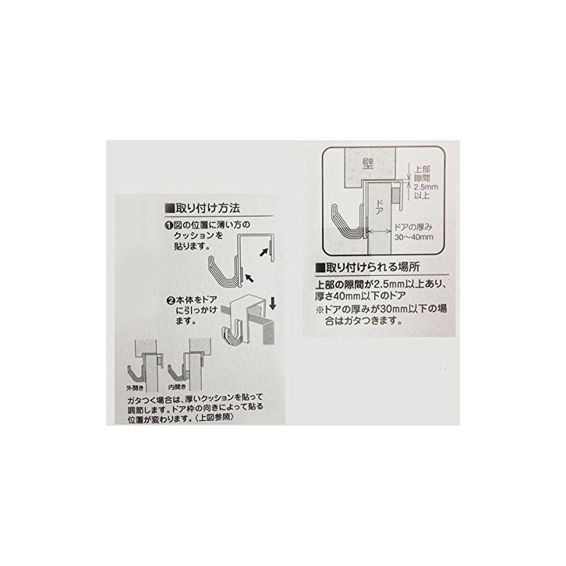 • This is a set of 2 door hooks. Clear finish complements any room. For doors with a gap above 2.5mm, door thickness less than 40mm. Adjustable cushion If the thickness of the door is less than 1.2 inches (30 mm), it will be rattle. Load Capacity: Up to 4.4 lbs (2 kg) per piece!
