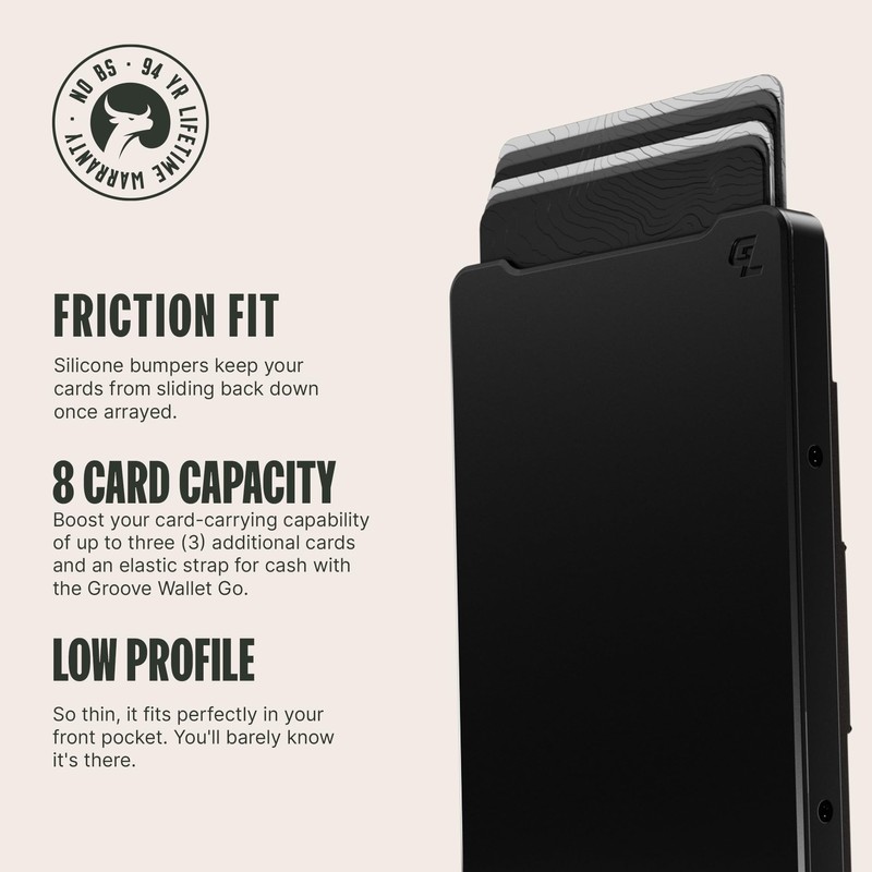 - NO BS WARRANTY; Adventure and innovation are at the core of who we are. Groove Life products are driven by those values and are designed for a lifestyle of adventure. In the event you adventure too far, and you feel like your Groove product is not living up to your standards, we’ll do what we can to make it right. Our 94 Year No BS Warranty covers any manufacturing damages to your wallet. If it's not our bad, (lost, cosmetic, etc.) we’ll cover that too! Replacement fees and taxes may apply.