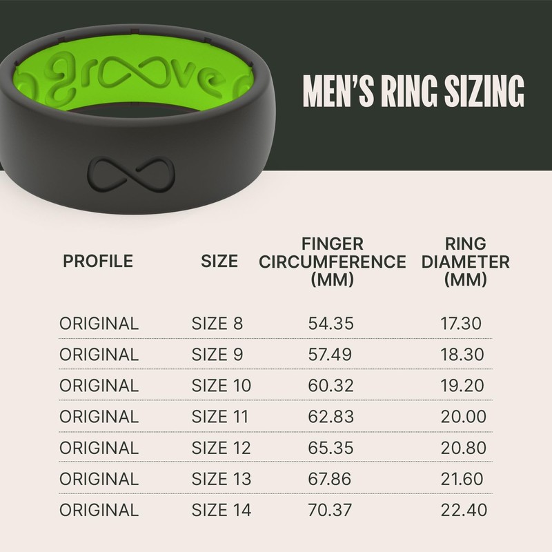 - SIZING - Made from 100% medical grade silicone that is not pre-relaxed, so you'll want to start off with a snug fit to allow for the extra room that comes once it's been worn regularly! Have a question about what size silicone ring you wear? Check out the sizing guide posted below under Product Guides and Documents. If you're in-between sizes, we recommend starting with the next whole size down. You can always call our customer service department for more assistance! (8mm wide)