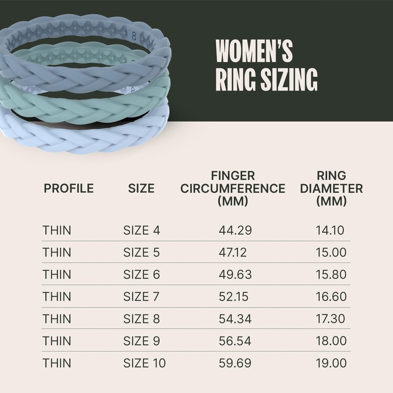- SIZING - Made from 100% medical grade silicone and a synthetic polymer elastomer blend, so we can have those awesome designs! If you plan on wearing all three rings together, we recommend going with the next whole size up. Typically, the wider the ring, the snugger it feels. Have a question about what size silicone ring you wear? Check out the sizing guide posted below under Product Guides and Documents. You can always call our customer service department for more assistance! (2.75mm wide each)