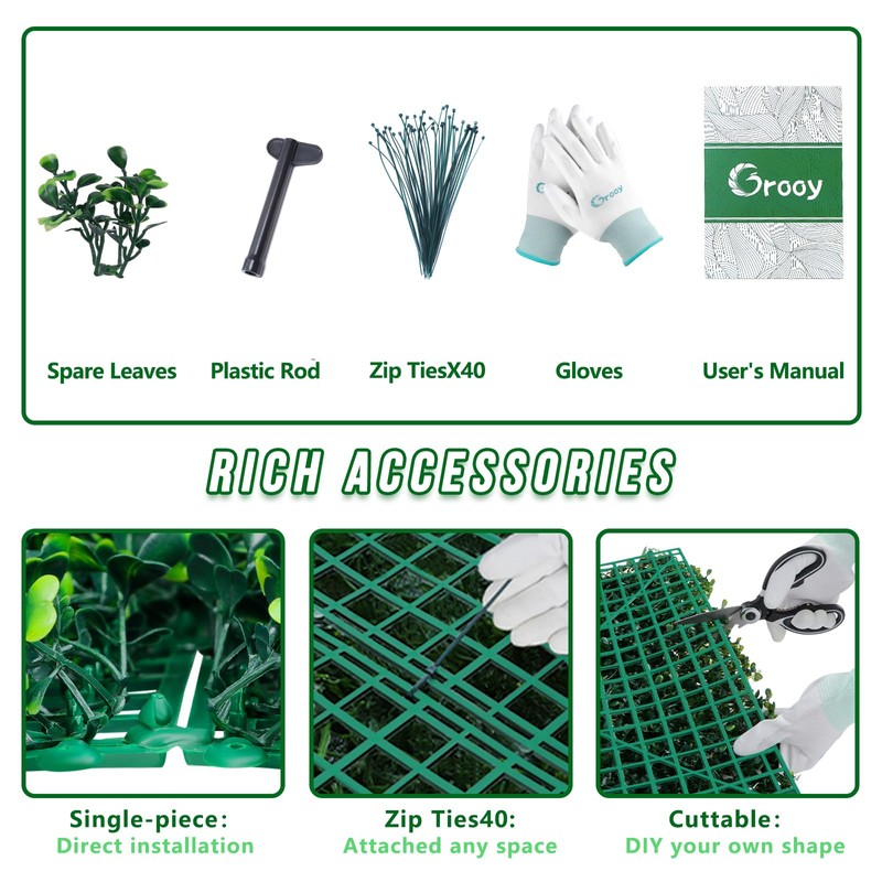 - 🌿【RICH ACCESSORIES & Customization】The artificial green panels includes single-piece(40"x120") with 40 zip ties, gloves, a plastic rod, and an installation guide for a quick and easy setup. No DIY skills needed. Customize panels effortlessly with basic cuts and shapes. Secure them using zip ties or drill for tougher surfaces.