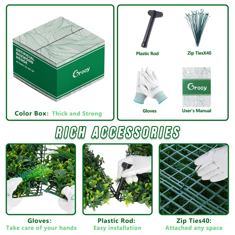 - đżăPremium Greenery, Built to LastăGrooy Artificial Boxwood Hedge Panels are made tough, using the latest in High-Density Polyethylene (HDPE). No matter the blazing sun or stormy weather, they'll stay vibrant and lifelike, adding a touch of nature that lasts.