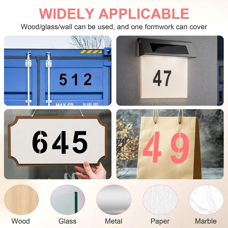 - 【Breites Anwendungsspektrum】: Die numerischen Muster eignen sich für verschiedene glatte Oberflächen, wie Holz, Papier, Glas, Metall, Böden usw. Sie eignen sich perfekt zum Markieren von Nummern an Türen, so dass Kuriere und Umzüge Ihr Zuhause schnell finden können. Sie können auch Ihrer Fantasie freien Lauf lassen und die numerischen Vorlagen verwenden, um zu erstellen.
