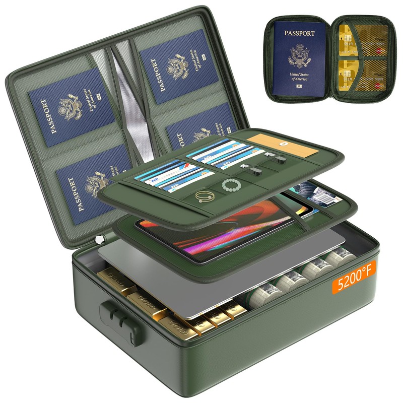 Grothery 5200°F Fireproof Document Box with Lock Fireproof & Waterproof File Organizer Box 8 Layer Heat Insulated Aluminum Foil Important Document Organizer Fire Proof Passport Travel Doc Holder Green