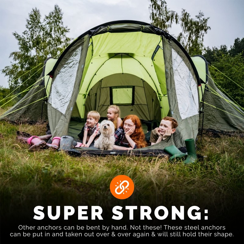 Anchor down camping tents, trampolines, boats, sheds, metal swingsets, playground equipment, tree houses, gazebos, shades, canopies, carports, vehicles, or anything else! Other uses include dog ground stake, as a tree anchor or for other horticultural needs, as soccer net anchors, or tarp spikes.