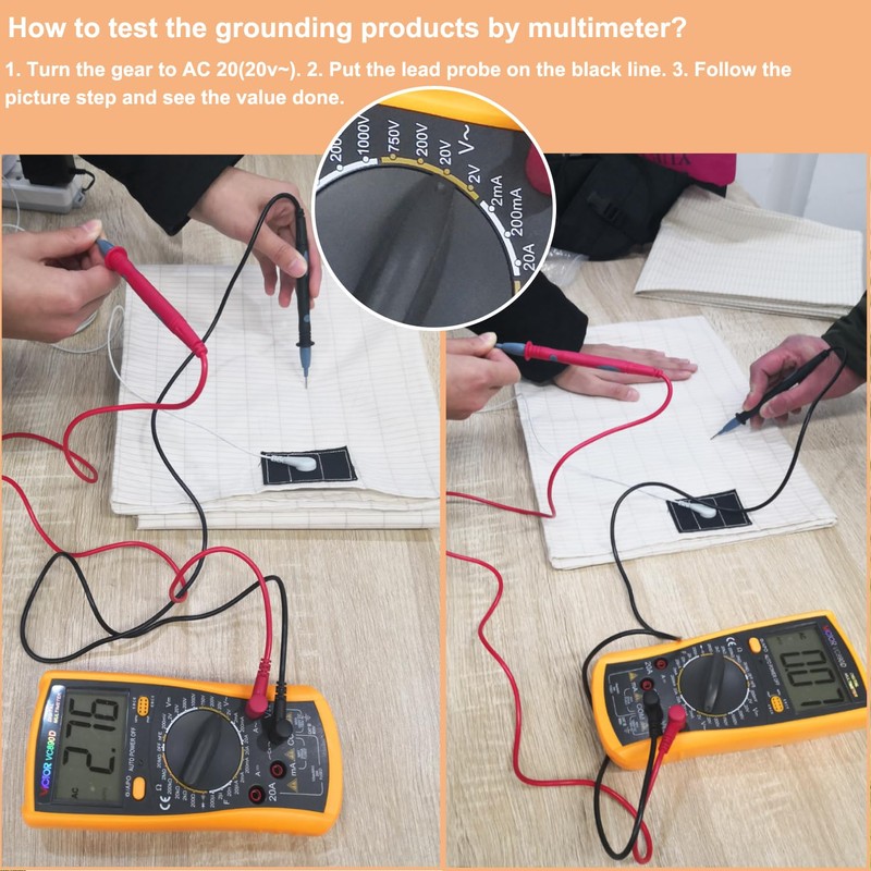 - Material and size: this grounding fitted sheet is in sizes 152*203*38cm and 193*203*38cm. The grounding sheet is made of conductive, high-quality material that is made of 95% soft, renewable and washable organic cotton fabric and 5% conductive silver fibre thread. With a 4.6 m DE grounding cable. Simply connect one end of the grounding cable to the mat and the other end to the ground wire of the socket on the wall.