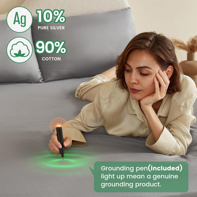 Grounding Sheets, 10% Silver Fiber Grounding Bed Sheets, Grounded Earth Sheets Bedding Fitted Sheets with Grounding Tester - [CK,Grey]