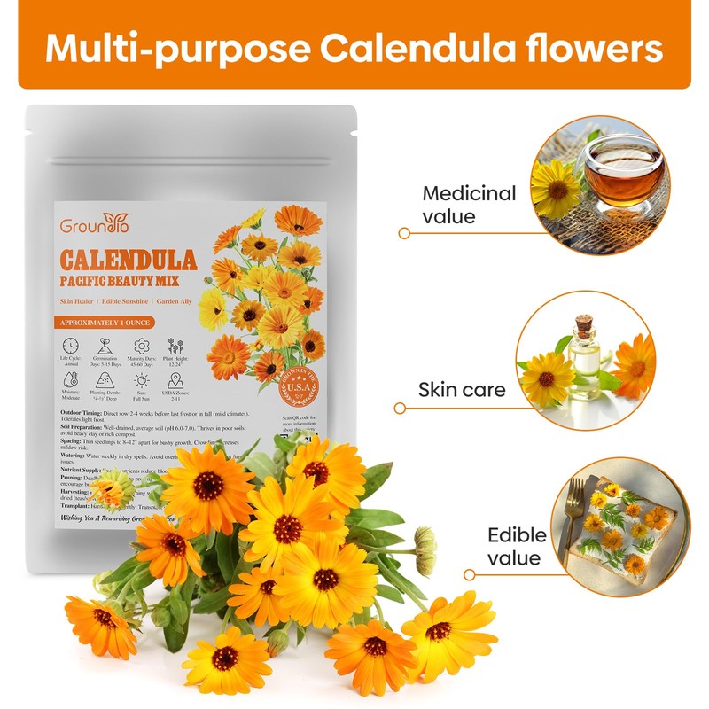 • Grown in the US: Groundio Calendula Seeds are purchased from farms we trust and have been rigorously tested to achieve a germination rate of 98%, ensuring that every seed is healthy and germinates smoothly
