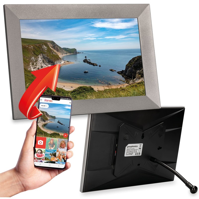 Grouptronics Gallery10 Easy To Use Wi-Fi Digital Photo Frame – 10 Inch, Send Photo or Video Via Free Phone App - Touch Screen, Auto Sleep & Rotate, Bendy Stand, Landscape or Portrait, 16GB - Silver