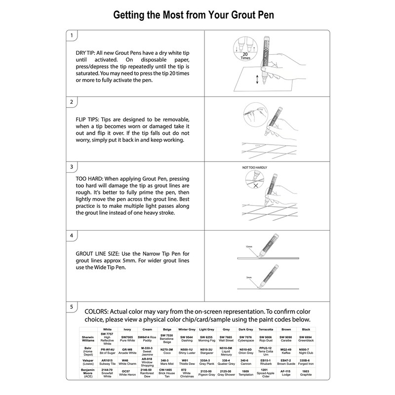 SIMPLE SOLUTIONDoes your tile grout dampen the look of your home? Want to spruce it up but don’t want to mess with bleach solutions or regrouting? Completely transform your tile grout with the Grout Pen, a safe and simple solution that lets you clean up grubby grout without the hassle. No scrubbing, bleaching, power washing, or regrouting required. Simply pump the pen until the paint starts flowing through the nib and get to coloring! USE ANYWHERECleaning and coloring grout has never been easier and you’ll love how the renewed lines give your home an instant makeover. Use the Grout Pen on the tile in the bathroom to freshen up the appearance of your shower, bathtub, sink, or windows. Take the pen to the kitchen and add a pop of color to tile counters, floors, or oven backsplashes. No grout is off limits! Once you’ve fully restored your grout, the pen can be used as a touch-up solution whenever needed.LONG LASTING INKQuickly change the color of your grout lines with a pen that’s designed to last. Our 5mm pen can cover up to 60 meters of narrow grout lines to tackle DIY projects of every size and feature a reversible nib to handle sanded and unsanded grout lines. The fast-drying paint will be touch- dry after 30 minutes, but to ensure the best results allow the paint to settle into the grout for 2 hours.RICH PIGMENTSAvailable with a 5mm or 15mm bullet nib, Grout Pen can cover thin and thick grout tracks. Choose from one of our 11 popular grout colors: white, black, winter grey, light grey, grey, dark grey, brown, cream ivory, terracotta, and beige.ADVANCED FORMULAThe paint used is carefully designed using a water-based formula that helps prevent staining and spots, and protects against grubby grout while delivering richly pigmented colors. Non-toxic and safe to use in enclosed spaces, the Grout Pen is an environmentally friendly option that allows you to quickly complete your home improvement upgrades!