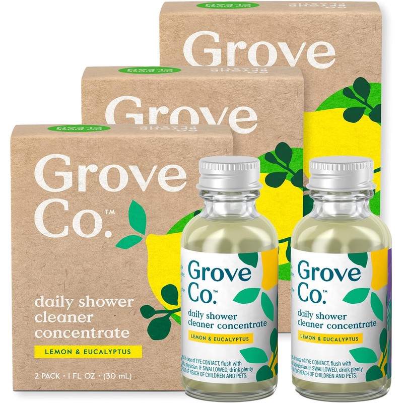 Grove Co. Daily Shower Cleaner Refill Concentrate (6 x 1 Fl Oz), Creates 16 Oz Cleaner, Removes Soap Scum, Scrub-Free, Plant-Based Household Cleaning Supplies, Lemon & Eucalyptus Fragrance