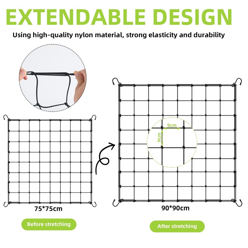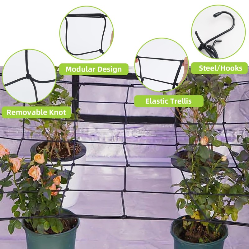 • Trellis net size: mesh size: 9 x 9 cm, keeps plants secure and ties them to supports. The elastic trellis net has excellent flexibility and elasticity to allow multiple indoor grows.