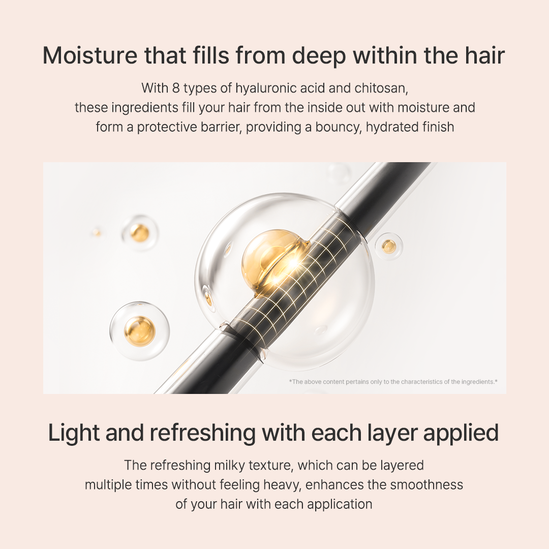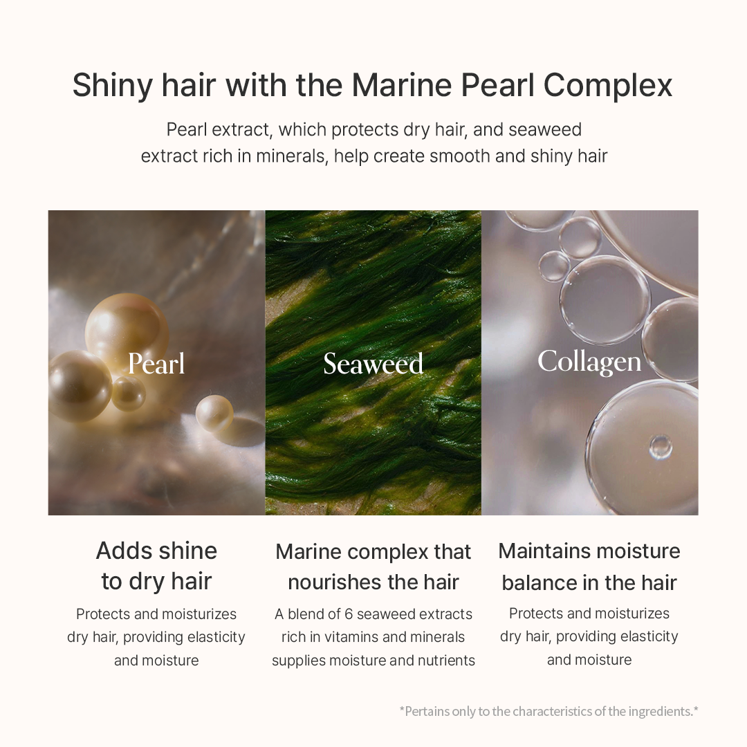 The 8 types of hyaluronic acid and chitosan ingredients moisturize and protect the inside and outside of the hair to create moisturized hair. The pearl extract and mineral-rich seaweed extract protect dry hair and complete it with softness and smoothness. Pearl provides shine to dry hair and provides moisturizing elasticity to the hair. The marine complex that helps provide hair nutrients contains six types of marine plant extracts rich in vitamins and minerals to provide moisture and nutrients. Collagen helps maintain the hair moisture balance with LPP&PPT to complete damaged hair as smooth and sleek. Protects hair damaged easily by various stimuli in daily life with Thermal Heat Protectant technology.
