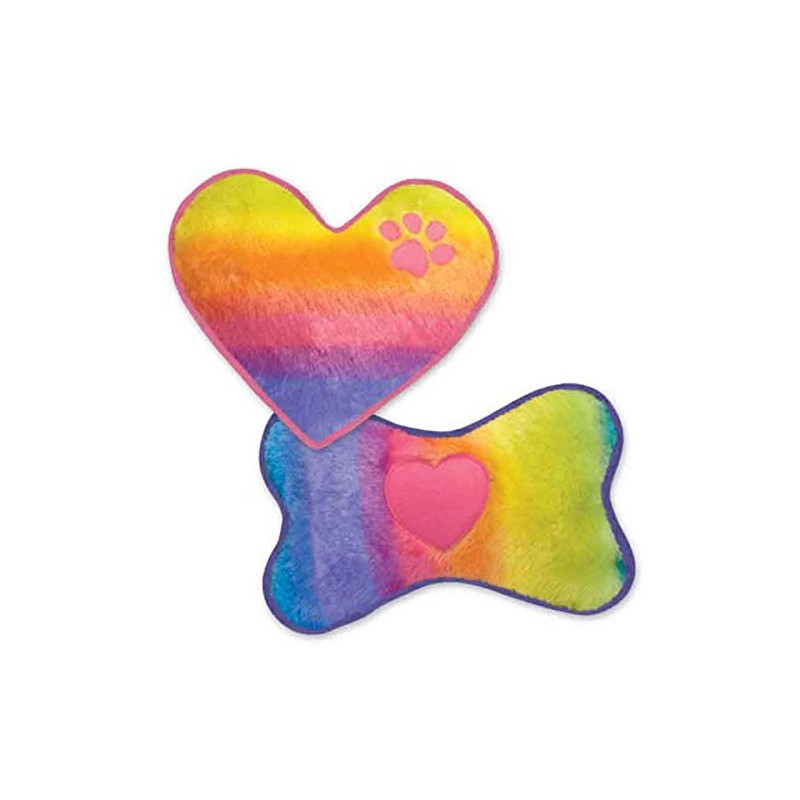 We added a dash of attitude to one of our favorite soft toys and created the Grriggles Rainbow Toys with a fun neon ombre print and squeaker. These cute Grriggles Rainbow Toys can be used to tempt the shyest pup to play or as a snuggling companion. On-trend neon ombre squeaker toys in fun shapes Dogs will love snuggling next to this soft-to-the-touch plush toy Sweet pink heart or pawprint applique Seams reinforced with nylon webbing for extra durability Materials: Polyester plush, polyfill, squeaker Sizes: Bones measure 12"L., Hearts measure 9½"L.
