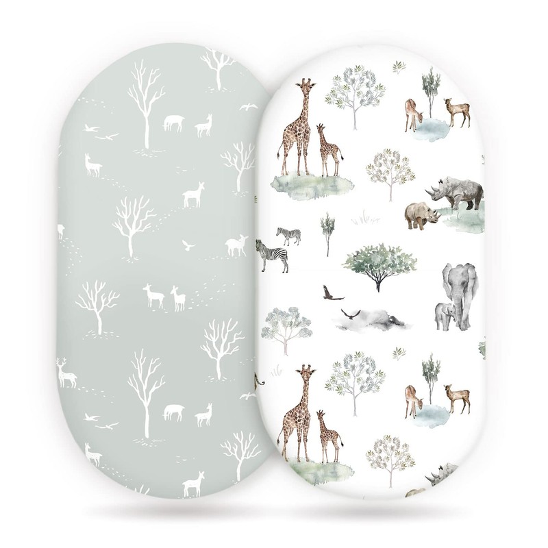 GRSSDER Stretch Ultra Soft Fitted Bassinet Sheet Set 2 Pack, Universal Fit for Bassinets Baby Cradle Moses Basket Oval Rectangle Mattress Safe and Snug, Pretty African Savannah Animals Pattern