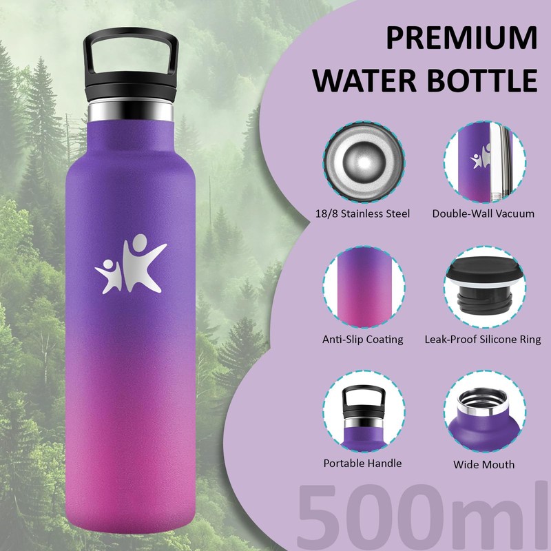 - Keeps you warm or cold: the 500 ml drinking bottle is made of double-layered stainless steel and has a double insulated design. The excellent insulation performance keeps your favourite drinks hot for 12 hours and cold for 24 hours. Whether hot or cold, it preserves the original warmth and freshness from morning to evening