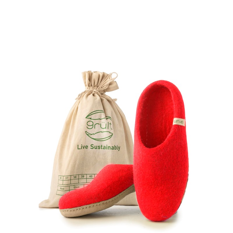 Grült Felt Slippers, Made from Sheep's Wool with Leather Sole, Felt Slippers for Women, Men, Slippers, red