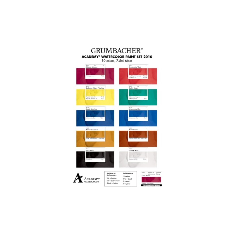 - Set includes: Alizarin Crimson, Burnt Sienna, Cadmium Yellow Pale Hue, Chinese White, Cobalt Blue Hue, Grumbacher Red, Ivory Black, Thalo Green (Blue Shade), Ultramarine Blue, and Yellow Ochre Hue.