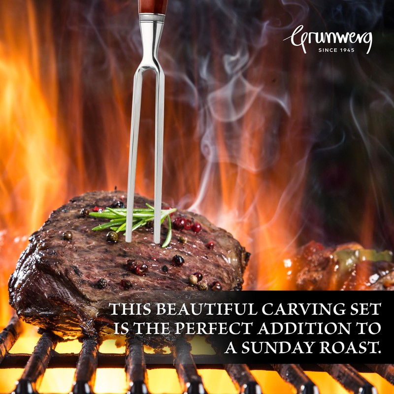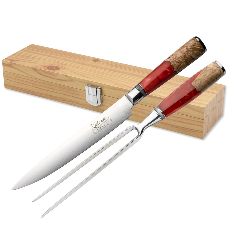 Grunwerg- Katana Elements 2 Piece Carving Knife and Fork Set With Wooden Box, Premium VG-10 Damascus Steel Blades, Olivewood And Resin Handle, Red