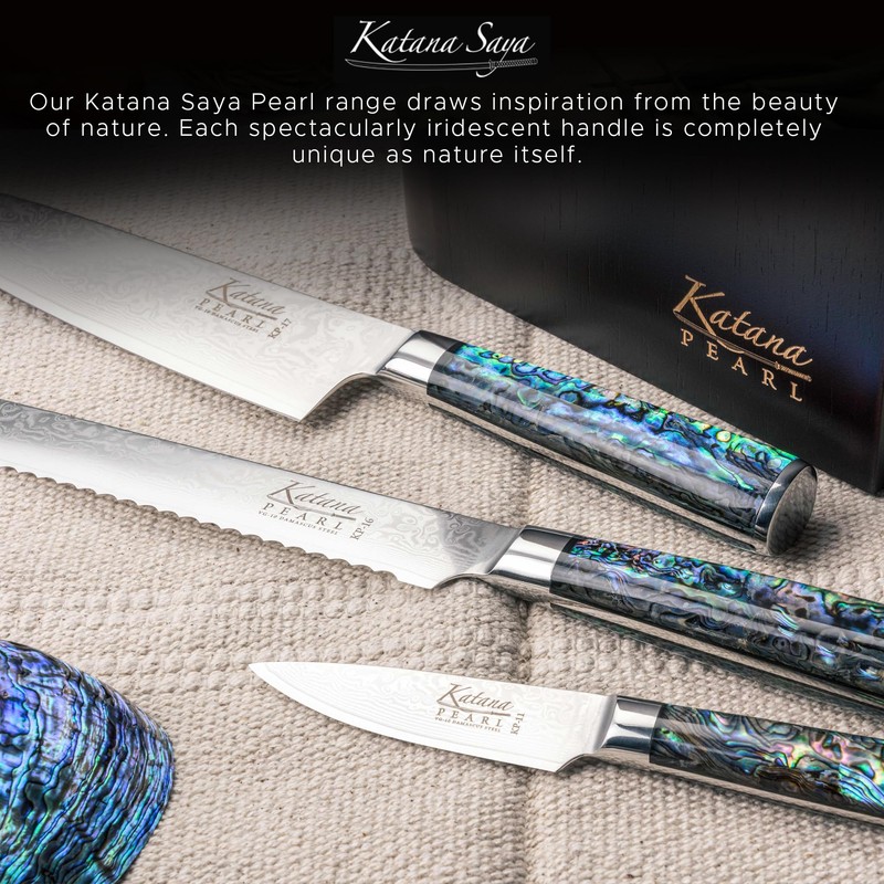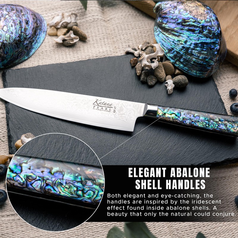 - Professional Kitchen Knives - Expertly designed with inspiration from the beauty of nature. With a high quality Japanese Damascus steel blade, paired with beautiful abalone shell handles. Incredible cutting performance for all cooking enthusiasts.