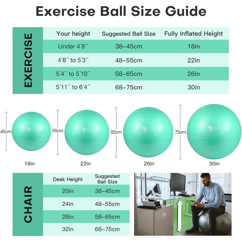 Gruper Yoga Ball, 55-75cm Extra Thick Exercise Ball for Workout Fitness Balance, Anti Burst Chair for Home and Office Desk,Includes Hand Pump & Workout Guide Access (Teal, 26 inch (65cm),L)