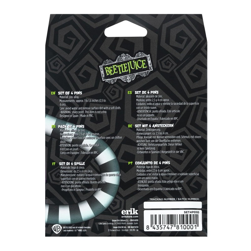 - SET OF 4 BADGES - Personalize your clothes with this personalized lapel pin set from Beetlejuice, a miniature artwork perfect for fans and collectors who appreciate detail and craftsmanship quality