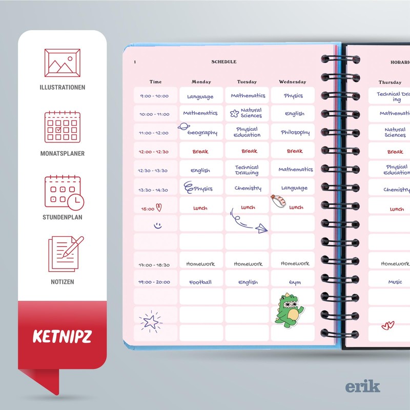 - Extras - The 2024 A5 diary not only has the personalised and colourful interior, the monthly planner and the year overview, but also leisure and timetables, an elastic band for secure closure, an inner pocket made of paper, two bookmarks and two pages with stickers for creative planning