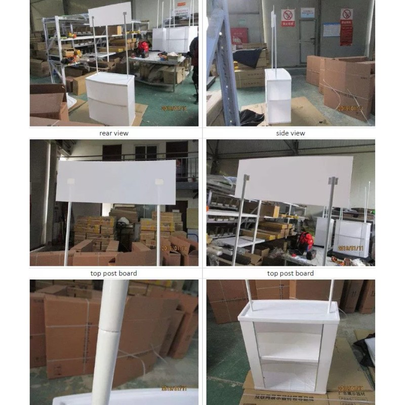 Estructura en PVC color blanco para exhibición, cuenta con un entrepaño y en la parte trasera una repisa para almacenar objetos. Fácil y rápido proceso de armado. Incluye maleta transportadora