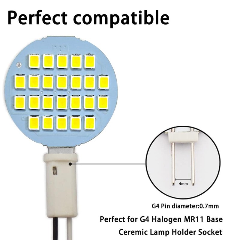 - Standard G4 bi-pin base, you can replace the old halogen bulb easily and it will fit the G4 base perfectly.The pin diameter is 0.7mm, which is better matched with G4 MR11 ceramic lamp socket plug.