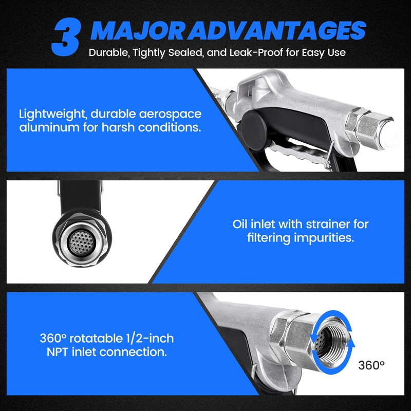- Multifunctional Design: The oil gun dispenser includes an inlet filter to block impurities and a 360° rotating inlet for easy, tangle-free hose connections