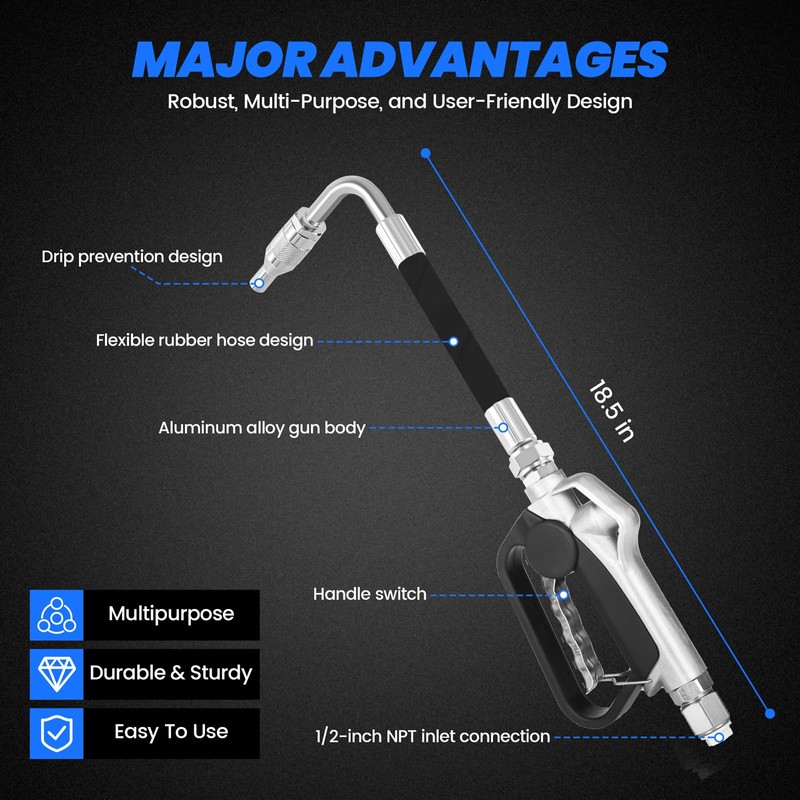 - Convenient Operation: The oil dispenser gun features an anti-drip design and a 90° oil nozzle for clean, accurate fueling. Its flexible hose bends easily to fit tight spaces, ensuring smooth operation